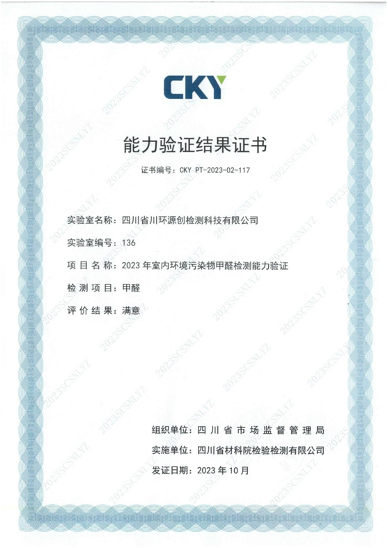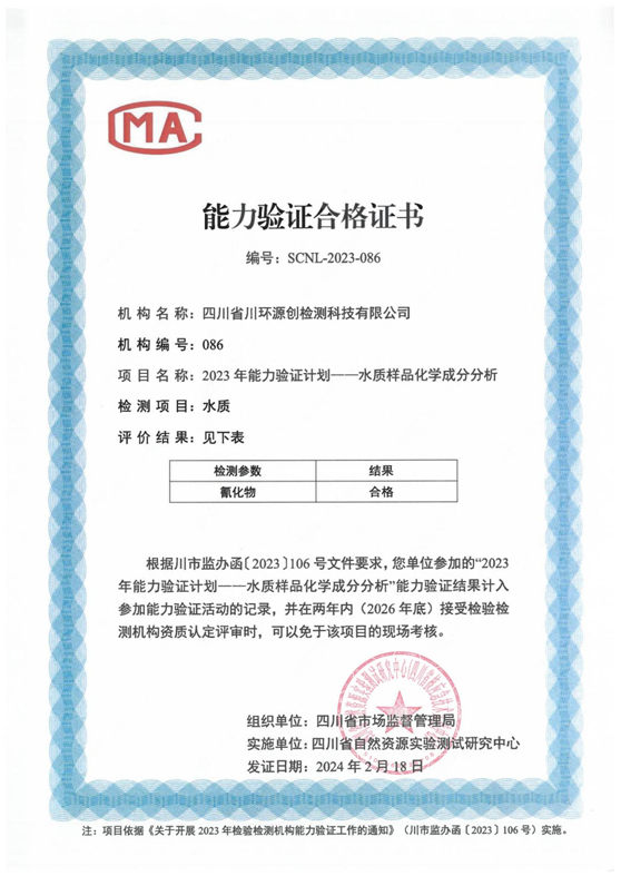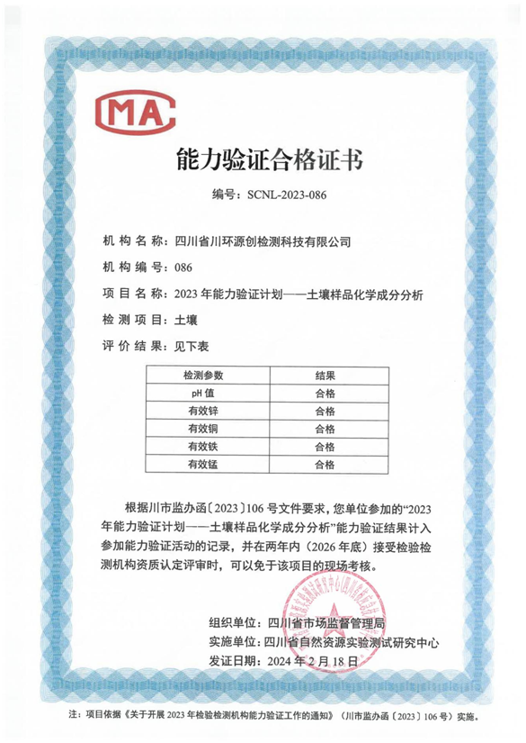 2024年2月,《四川省市場監(jiān)督管理局關(guān)于2023年度檢驗檢測機構(gòu)能力驗證結(jié)果的通告》(2024第3號)發(fā)布,本公司順利通過了2023年度省級能力驗證考核的全部參考項目。